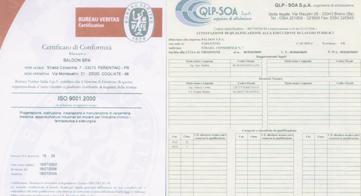 La Baldon Spa opera in conformità alle norme vigenti ed è in possesso del certificato di conformità ISO 9001, ISO 3834 e del certificato di centro di trasformazione.