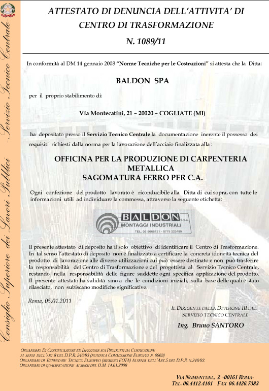 Baldon S.P.A ha ottenuto S.O.A per le categorie: OS 18 classifica IV: componenti strutturali in acciaio e metallo